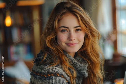 Beautiful young lady with long golden hair and a warm smile, wearing a cozy knitted sweater in an indoor setting