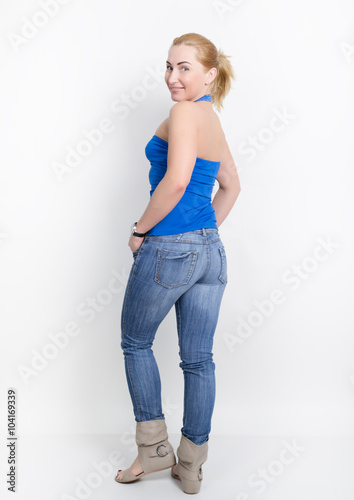 beautiful young leggy blond girl in a jeans and a blue shirt in a boots, full height posing