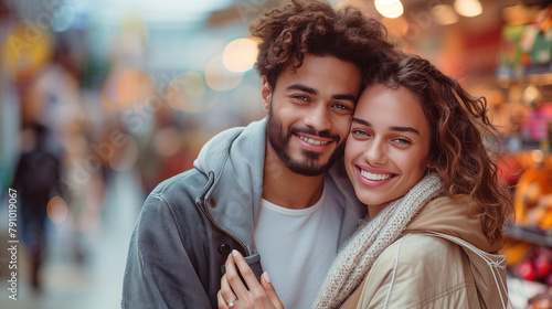 Beautiful young loving couple while shopping.