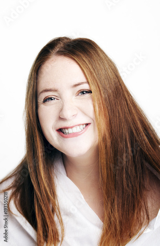 Beautiful young redhead woman with freckles portrait isolated on white