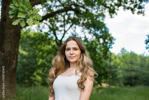 Beautiful young Russian girl dressed in a white dress, walks through the forest among the oaks in the rays of the sunset