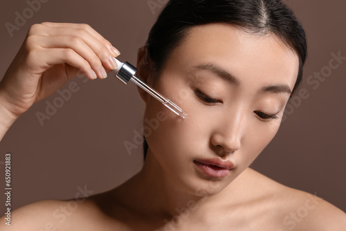 Beautiful young woman applying cosmetic serum onto her face on brown background, closeup