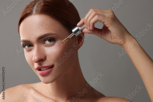 Beautiful young woman applying cosmetic serum onto her face on grey background