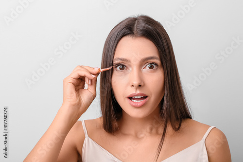 adult, applying, artificial, attractive, background, beautiful, beauty, care, caucasian, chestnut, cosmetic, cosmetology, decorative, stretches, emotional, extension, eyebrow, eyelash, eyelash, eye, face, fake, fashion, female, girl, glamour, grey, hair, lash, light, make-up, mascara, people, person, portrait, style, surprised, treatment, trend, tweezer, visage, vogue, volume, woman, young
