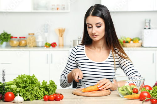 Beautiful young woman cooking salad in the kitchen