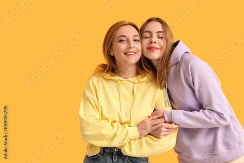 Beautiful young woman hugging her mother on yellow background. International Hug Day