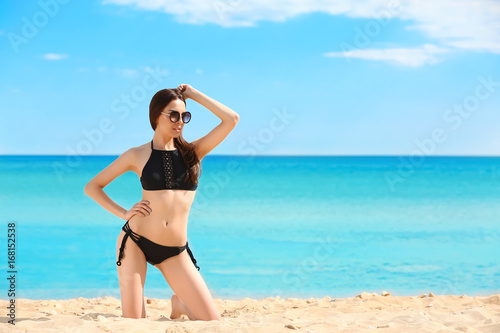 background, beach, beautiful, bikini, blue, body, caucasian, clothes, coast, day, elegant, fashion, fashionable, female, girl, glamour, holiday, knee, leisure, model, modern, outdoors, person, pretty, relax, rest, sand, sea, seductive, sexy, shape, shore, standing, style, stylish, summer, summer, sun tanning, sunglasses, sunlight, swim, swimwear, swimwear, trend, trendy, vacation, vogue, wax, woman, young