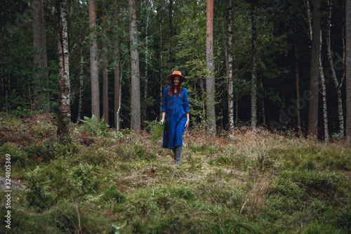 Beautiful young woman in blue dress and hat with leaf of ferns in hands on forest background. Place for text or advertising