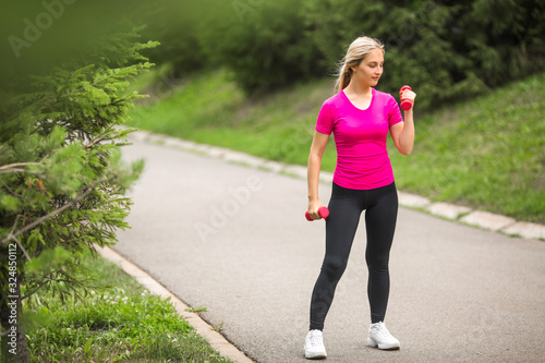 beautiful young woman in sports pink t-shirt   with dumbbells in hands in the summer park