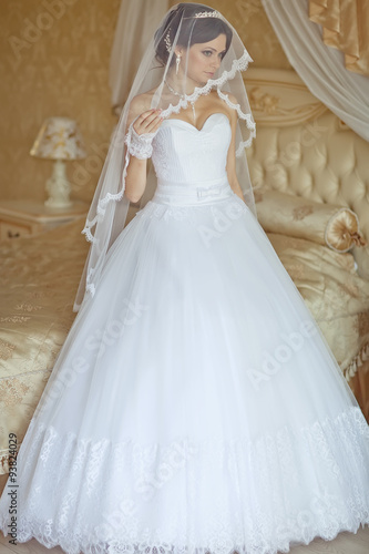 Beautiful young woman in white dress preparing herself to wedding