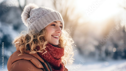 girl, woman, caucasian, snow, winter, smiling, side, portrait, outside, morning, light, young, hat, casual attire, looking, away, day, december, jan, cold, clothes, model, european, jacket, copy, space, countryside, street, village, white, nature, natural, happy, smile, joy, sun, blond, beauty, background, fashion, season, fur, outdoors, christmas, clothing