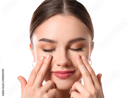 Beautiful young woman massaging her face on white background