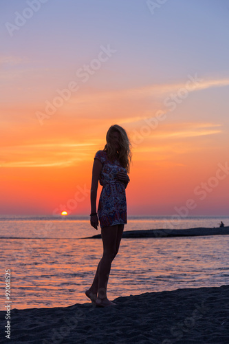 Beautiful young woman on beach at sunset