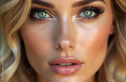Beautiful young woman portrait with bright green eyes, long lashes. Full, glossy lips, perfect glowing skin. Blonde wavy hair frames face. Beauty, fashion, skincare, pro makeup artistry.