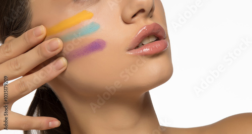 Beautiful young woman posing with different tones of eyeshadows on her face.