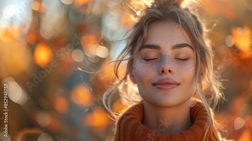 Beautiful young woman relaxing at park during autumn season with closed eyes.