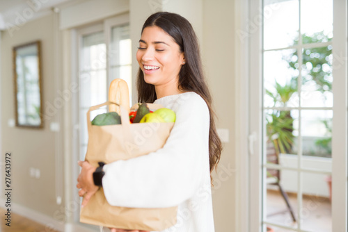 Beautiful young woman smiling holding a paper bag full of fresh groceries at home