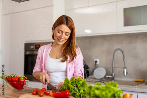 Beautiful young woman stand at modern kitchen chop vegetables prepare fresh vegetable salad for dinner or lunch, young woman cooking at home make breakfast follow healthy diet, vegetarian concept