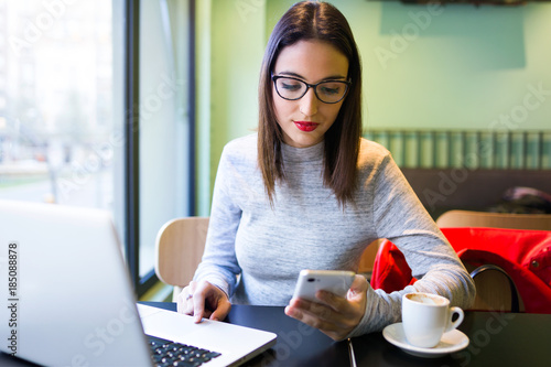 Beautiful young woman using mobile phone while drinking coffee in the cafe.