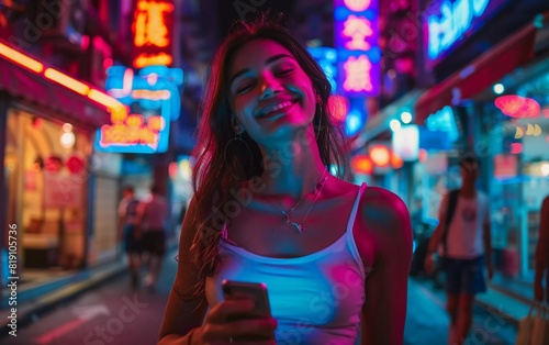 Beautiful Young Woman Using Smartphone Standing on Night City Street Full of Neon Lights. very beautiful woman