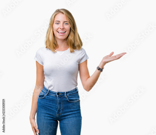 Beautiful young woman wearing casual white t-shirt over isolated background smiling cheerful presenting and pointing with palm of hand looking at the camera.