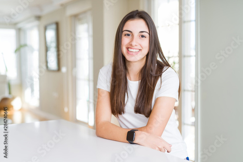 young, woman, girl, teenage, brunette, hispanic, beautiful, portrait, indoor, home, window, bright, light, natural, casual attire, sitting, watch, t-shirt, white, table, smiling, happy, smile, cheerful, looking, face, background, fashion, positive, happiness, lifestyle, confident, business, cool, confidence, success, joy, person, laugh, laughing, style, honed, teeth, mouth, trust, proud, front, excited, lucky
