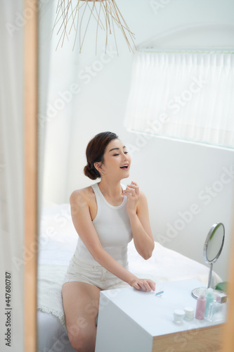 vietnamese, chinese, korean, japanese, asian, girl, applying, female, beautiful, perfume, young, woman, aroma, bottle, portrait, glamour, pretty, beauty, home, luxury, fragrance, spray, care, looking, cosmetic, body, mirror, make-up