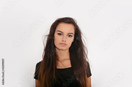 Beautiful young woman with brunette hairstyle with no make-up, standing frontal looking at camera over white background.