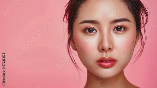 beauty, woman, portrait, skin, make-up, natural, youthful, flawless, closeup, pink, background, fresh, face, radiant, glow, cosmetic, skincare, model, female, asian, elegant, soft, smooth, healthy, attractive