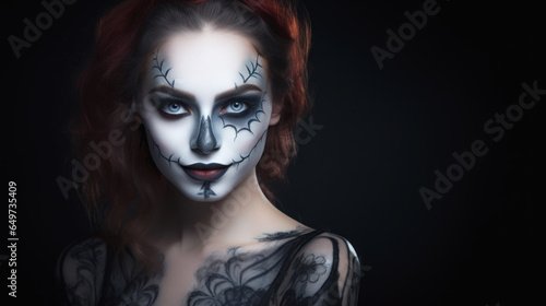 day of the dead, dark background, grey background, light, death, lady, make-up, masquerade, mexican, skull, dead, halloween, woman, young, celebration, decoration, girl, adult, dark, fear, design, mystery, face, make-up, art, evil, beautiful, portrait, sorcerer, female, scarey, lip, costume, paint, studio, carnival, creepy, closeup, looking, autumn, festive, holiday, gothic, horror, october, white, copy space