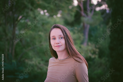 Beautiful young woman with long brown hair in summer park, botanical garden. Portrait of a pretty sexy girl 20-30 years smiling posing looking in camera. People on nature in the woods, wood, forest.