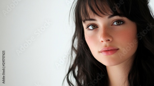 young, woman, beautiful, portrait, long, dark, hair, soft, feature, bright, white, background, natural, beauty, elegance, smiling, closeup, facial, expression, fresh, skin, charming, stylish, attractive, graceful, serene, eye, make-up, natural light, youthful, delicate, femininity, simplicity, relaxation, inspiration, confidence, portraiture, studio, aesthetic, model, fashion, trendy, timeless, glowing, innocence, warmth, health, calm, peaceful