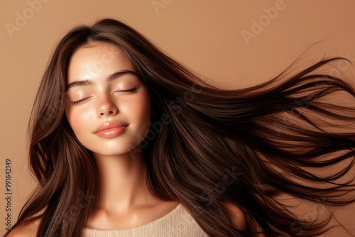 Beautiful young woman with long hair on brown background, closeup. Ad for shampoo conditioner hair products. Girl with beautiful healthy long shiny brown hair .geneative ai