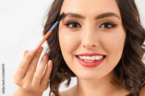 Beautiful young woman with stylish makeup and brush on light background