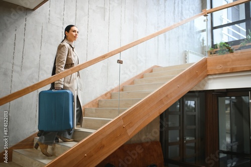 Beautiful young woman with suitcase going up stairs in hotel