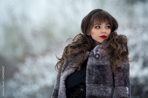 Beautiful,attractive,adorable,rich,nice,lovely girl in a luxury,rich mouton,mink fur coat standing in cold,snow,winter forest with good make-up,curly hair,pretty eyes,red lips,looks aside,stylish fur.