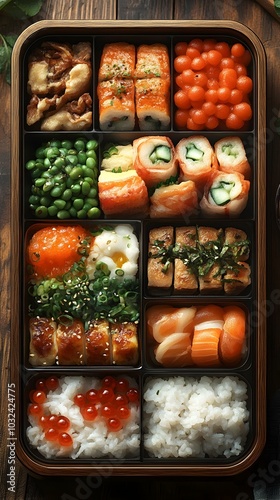 Beautifully Arranged Modern Bento Box Showcasing Diverse Japanese Cuisine