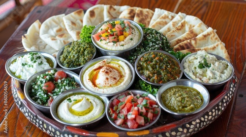 beautifully arranged platter of Lebanese mezze with hummus, tabbouleh, baba ghanoush, and pita bread, showcasing a variety of flavors