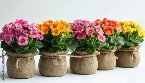 Beautifully arranged vibrant flowering pots lined up on a neutral background showcasing a variety of colors and