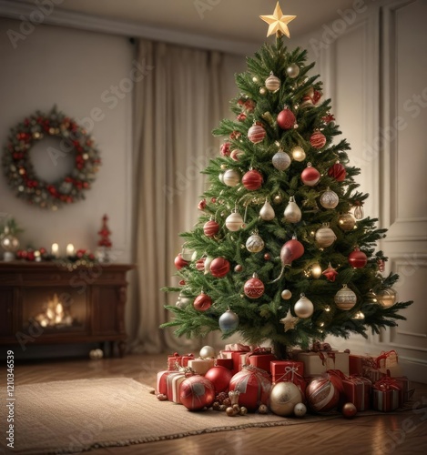 beautifully decorated Christmas tree with ornaments, twinkling lights, colorful ornaments
