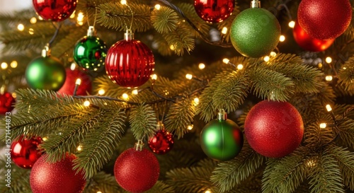 Beautifully Decorated Christmas Tree with Red and Green Ornaments and Twinkling Lights