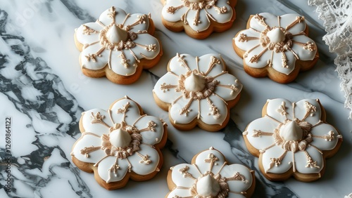 Beautifully decorated cookies in floral shapes on a marble surface.