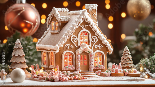 Beautifully decorated gingerbread house with glowing windows, surrounded by festive ornaments and holiday lights, creating a cozy Christmas scene