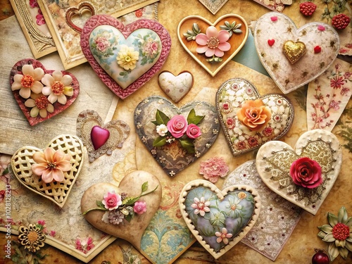 Beautifully Decorated Hearts and Postcards for Romantic Occasions, Valentine's Day, Love Notes, Crafting, Greeting Cards, Artistic Designs, Handmade Gifts, Nostalgic Stationery