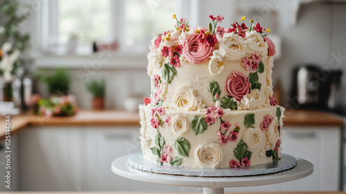 Beautifully Decorated Two-Tier Cake with Flower and Rose Decorations in a Bright Kitchen Setting Perfect for Celebrations and Special Occasions