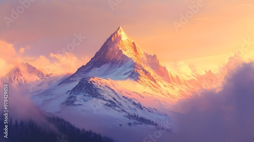Beautifully illustrated mountain landscape, soft pastel colors, hyper real, high quality, sharp details, graphic art