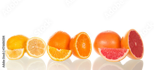Beautifully laid whole citrus fruits and their slices isolated on white background