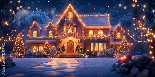 Beautifully lit house with twinkling Christmas lights and holiday decorations.