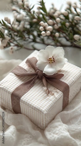Beautifully packed gift boxes with flowers on a light background create a festive atmosphere. Delicate floral decor adds a touch of charm to gifts
