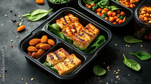 meal, box, portion, almond, spinach, tofu, grilled, nourishment, wellness, healthy, balanced, clean, vibrant, fresh, lifestyle, organic, vegetarian, vegan, fitness, food, lunch, dinner, protein, greener, nut, colourful, concept, plated, modern, stylish, wholesome, energy, diet, prepared, ready, epicure, delicious, simple, minimal, natural, nutrient, active, fuel, body, health